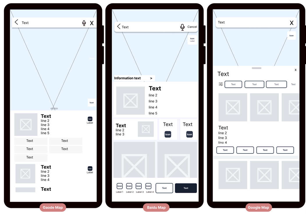 • Gaode and Baidu, on the other hand, have a more cluttered layout due to multiple content blocks.