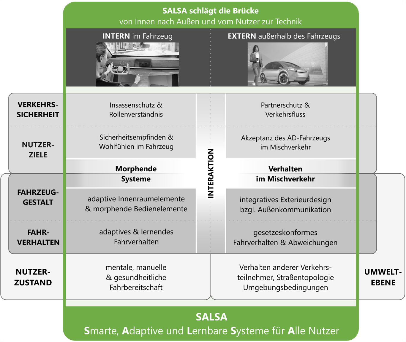 Abbildung: SALSA Ansatz mit der Verknüpfung der intern/extern Sicht sowie Fahrzeuggestalt, Fahrverhalten und Interaktionskonzepten
