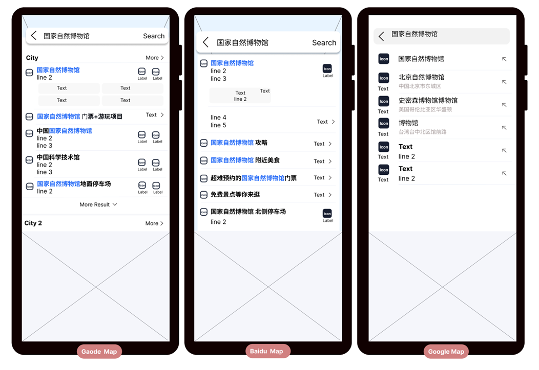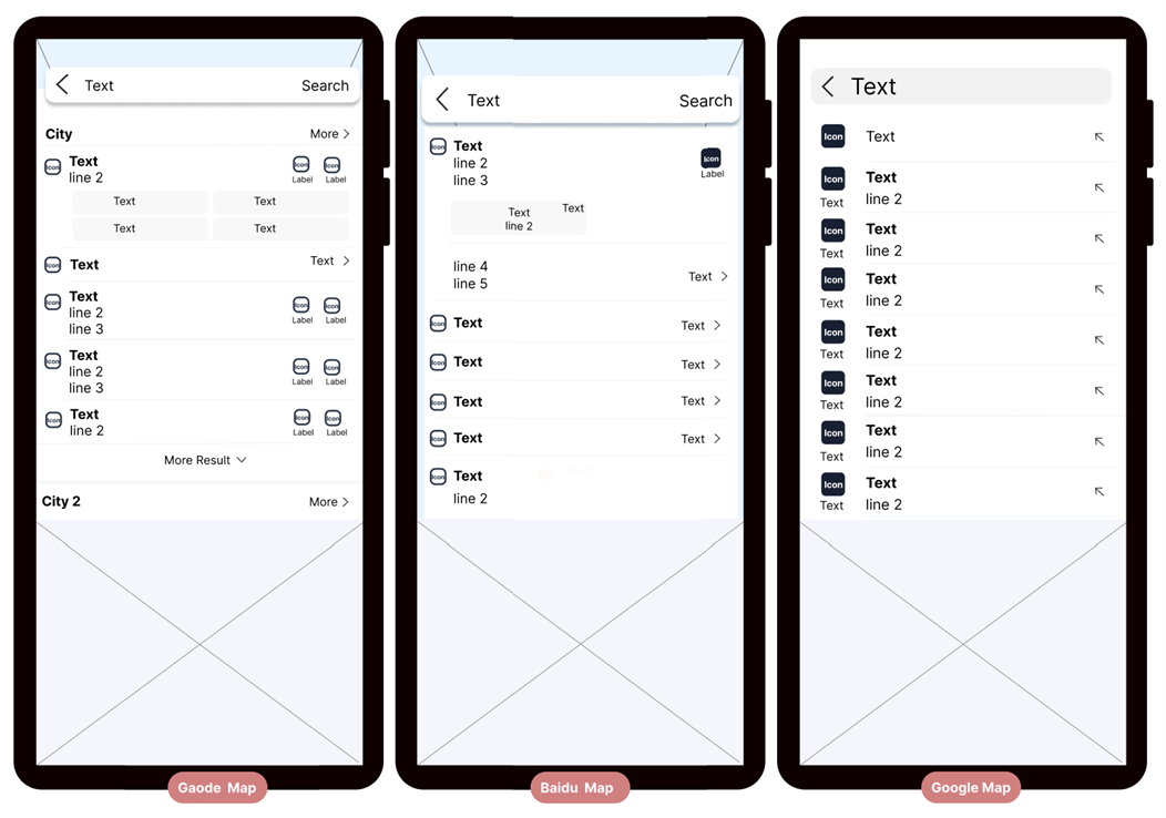 - Gaode and Baidu, on the other hand, have a more cluttered layout due to multiple content blocks.